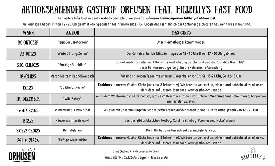 Am Liebsten mögen wir es, wenn Leben in und um unseren Gasthof herum stattfindet. So finden übers Jahr verteilt verschiedene Events statt: z. B. Pop up-Restaurant zu Ostern, Kochkurse und unser jährliches Jubiläumsfest vom Hillbilly's.